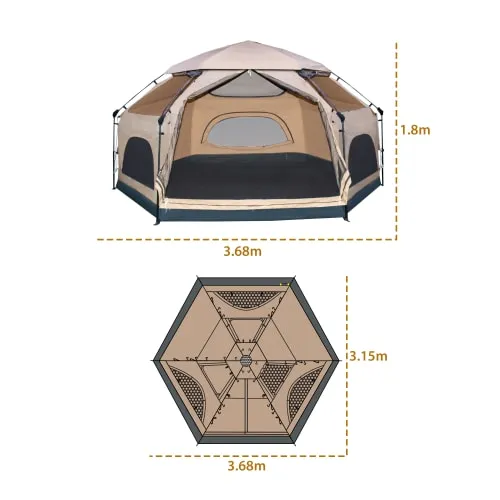 تأتي الخيمة بأبعاد كبيرة جدًا 3.68 × 3.68 × 1.8 متر لتمنحك مساحة داخلية رحبة مناسبة للعائلات والجلسات.
