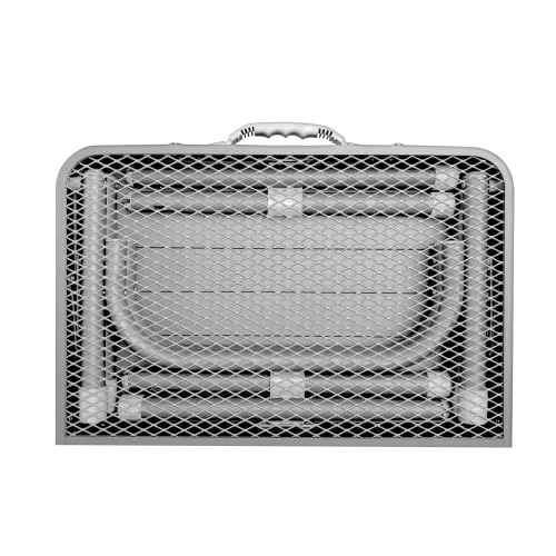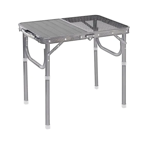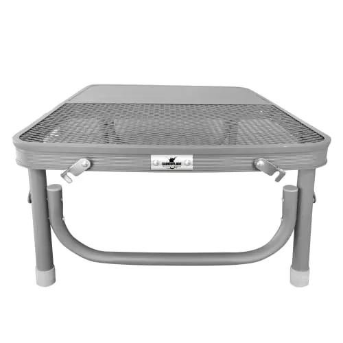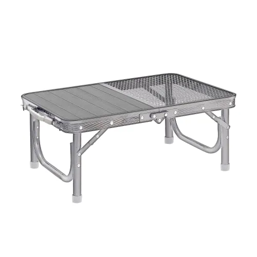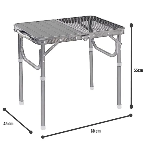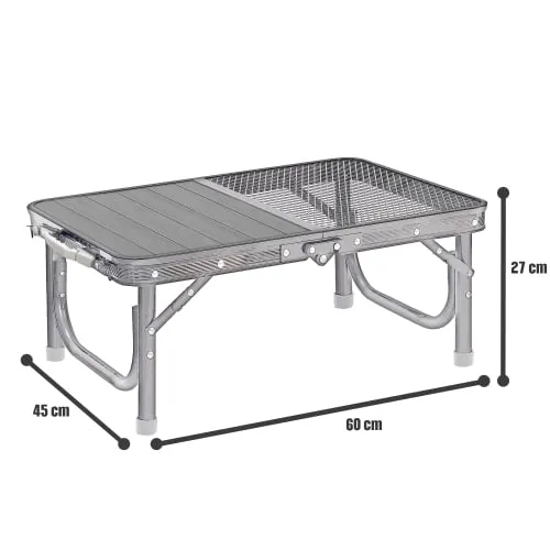 طاولة الألمنيوم 60× 45سم بسطح مزدوج تعتبر خيار عملي لمحبي الرحلات والتخييم. تصميم السطح نص ألمنيوم ونص شبك يمنحك مرونة أكبر في الاستخدام، حيث يوفر جزء الألمنيوم سطحًا ثابتًا للأدوات، بينما يساعد جزء الشبك على التهوية وتقليل تجمع الحرارة.