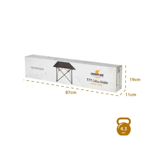 طاولة الرحلات T77 مصممة لتكون رفيقك العملي في التخييم والرحلات والجلسات الخارجية. مصنوعة من مزيج الألمنيوم والحديد لتمنحك قوة وثبات ممتازين، مع مقاومة جيدة لمختلف الظروف الجوية.